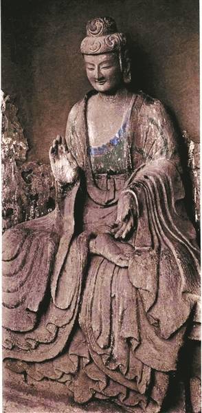 如果你想在一个地方集中体会中国造像这个特点,那就来麦积山吧。谈起麦积山石窟,一个关键词就是“东方微笑”。被称为“东方微笑”的这尊佛像,是44窟的西魏时期造像,学界普遍认为,这尊像的面容是仿照西魏文帝的皇后乙弗氏塑造的。这尊造像高1.6米,头上有着右水涡纹高肉髻,内穿僧祗支,胸前系结,外披通肩袈裟,半结跏趺坐。主佛的面形方圆适中,眉宇间透露出睿智而深沉的灵气,鼻梁高且修直,与额头相连,在秀骨清相之中又透出些许丰腴。最为动人的便是那薄唇小口,笑靥微绽,那神秘的微笑,是一种无念无挂的大自由状态。整个面部慈悲而庄严,娴静而宽容。