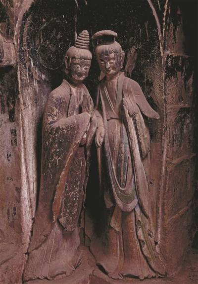 麦积山的佛像大多体量大小与真人等同,表现手法多为圆雕和高浮雕,使信众在观看时,心理上有一种亲近感。与“皇家石窟”云冈、龙门和“富商石窟”敦煌石窟不同,麦积山石窟是由当地官吏和民众打造出的一座名副其实的民间石窟,它不可避免地更多关注当地人自身的情感生活与内心世界,因而具有浓郁的世俗化和人性化色彩。