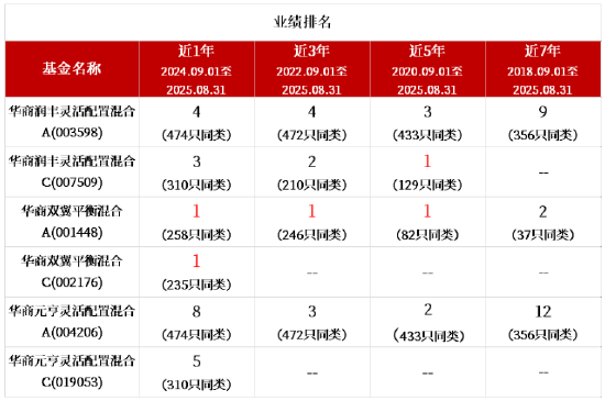 数据说明:文中基金经理关注的投资方向,仅为结合当前市场情况作出的判断,可能随市场情况调整,具体投资策略详见基金法律文件及基金最新定期报告。基金的超额收益指区间基金净值增长率减除该基金业绩比较标准的同区间的收益率后的结果。基金业绩排名数据来自银河证券,2025年9月发布,数据截至2025.08.31;华商润丰灵活配置混合A、华商元亨灵活配置混合A基金分类为灵活配置型基金(基准股票比例60%-100%)(A类),华商润丰灵活配置混合C、华商元亨灵活配置混合C基金分类为灵活配置型基金(基准股票比例60%-100%)(非A类),华商双翼平衡混合A/C基金分类分别为普通偏债型基金(股票上限高于30%)(A类)/(非A类);以上6只基金在银河证券一级基金分类中均为混合基金;如文中所列表格显示,未显示近3年、5年、7年排名的,说明该基金(份额)成立时间未满排名统计日期,故无同期排名。