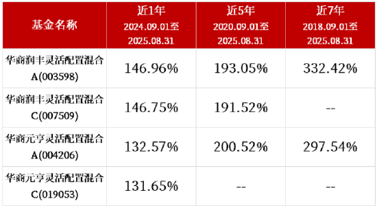 时间截至2025.08.31的基金业绩数据来自华商基金,经托管行复核;华商润丰灵活配置混合、华商元亨灵活配置混合业绩比较基准相同,近1年(2024.09.01至2025.08.31)基金业绩比较基准收益率26.61%,近5年(2020.09.01至2025.08.31)基金业绩比较基准收益率6.80%,近7年(2018.09.01至2025.08.31)基金业绩比较基准收益率40.85%,同期业绩比较基准数据来自万得信息。基金各年度净值增长率及同期业绩比较基准增长率均来源于基金定期报告。最新基金份额净值详见华商基金官网。